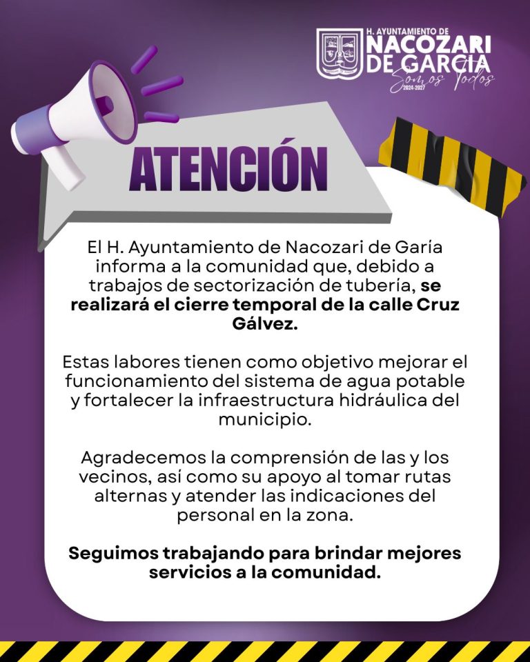 Se informa a la comunidad que se llevará a cabo el cierre temporal de la calle Cruz Gálvez, con motivo de los trabajos de sectorización de la red de tuberías.