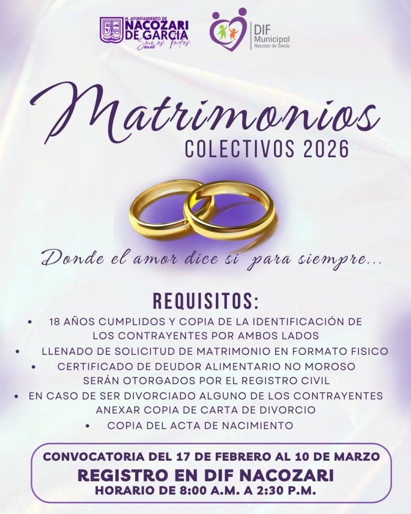 El Ayuntamiento de Nacozari de García a través de DIF Nacozari invita a todas las parejas a formar parte de los Matrimonios Colectivos 2026, una oportunidad especial para unir sus vidas de manera legal y celebrar el amor en comunidad. Convocatoria: del 17 de febrero al 10 de marzo de 2026 Registro: en DIF Nacozari […]
