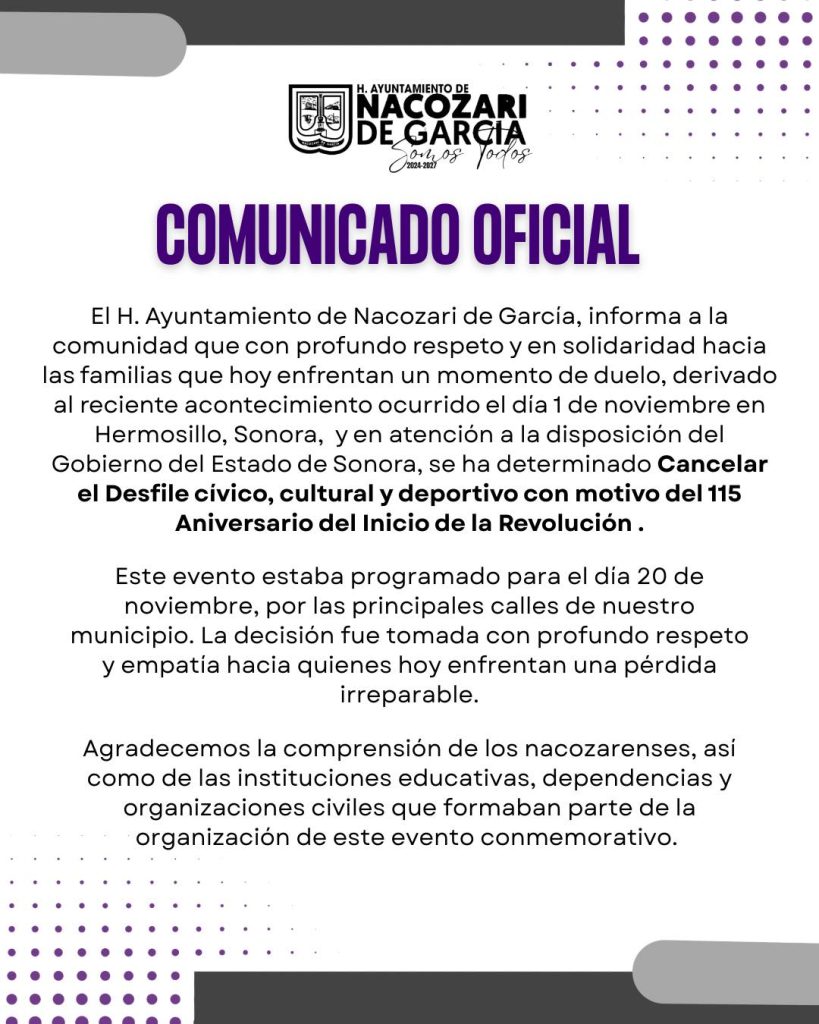 El H. Ayuntamiento de Nacozari de García informa a la comunidad que el Desfile Cívico, Cultural y Deportivo, programado con motivo del CXV Aniversario del Inicio de la Revolución Mexicana, ha sido cancelado. Esta decisión se adopta en solidaridad con el lamentable acontecimiento ocurrido el pasado 1 de noviembre en la ciudad de Hermosillo, Sonora, […]