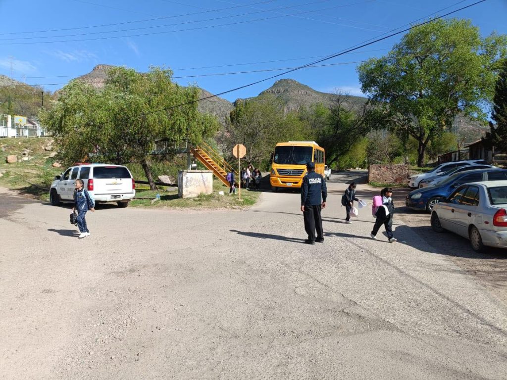Elementos de la Seguridad Pública Municipal se mantienen atentos durante los horarios de entrada y salida en todos los niveles educativos, con el objetivo de apoyar la vialidad y salvaguardar la integridad de niñas, niños y jóvenes, así como de madres y padres de familia en el municipio de Nacozari.