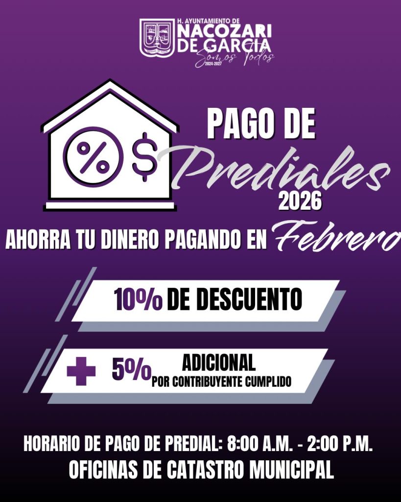 El H. Ayuntamiento de Nacozari de García, a través de la Dirección de Catastro Municipal, invita a la ciudadanía a cumplir oportunamente con el pago del impuesto predial y a formar parte de las y los contribuyentes responsables que contribuyen al desarrollo y fortalecimiento de nuestro municipio. Durante el mes de febrero, se otorga un […]