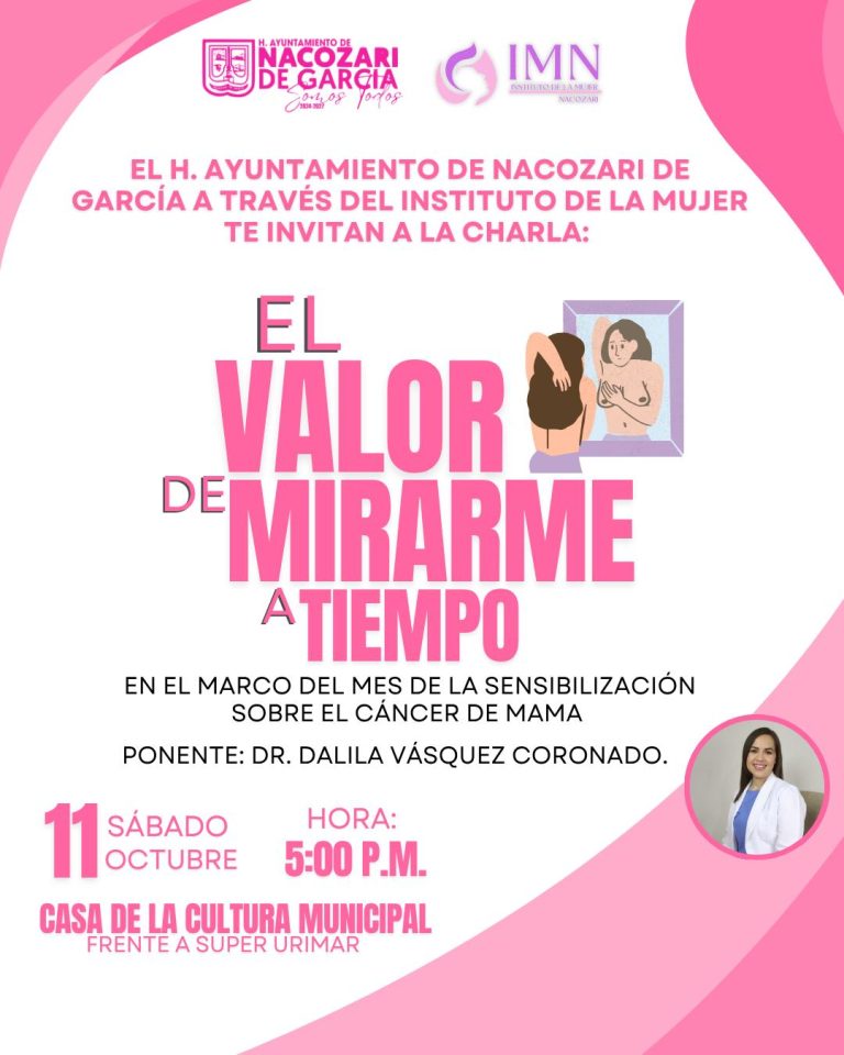 El H. Ayuntamiento de Nacozari de García, a través del Instituto Municipal de la Mujer, tiene el honor de invitar a la ciudadanía a la charla titulada: “El valor de mirarme a tiempo”, en el marco del Mes de Sensibilización sobre el Cáncer de Mama.